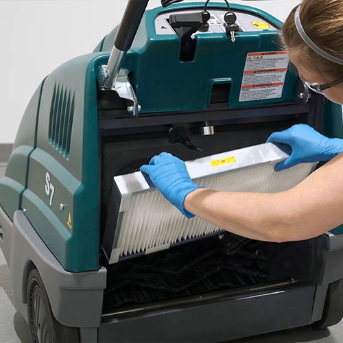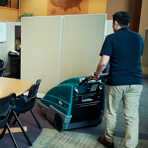 A S7 é uma varredeira versátil de operação a pé alimentada a bateria que limpa pisos duros e carpetes.
